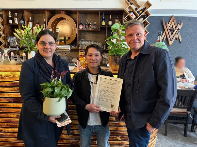 Am 15.04.2026 haben die Vorstandsmitglieder Ines Müller und Tino Morgner dem neu eröffneten Restaurant „YumYum Quán“ in der Dr.-Friedrich-Str. 11 in Oelsnitz gratuliert.